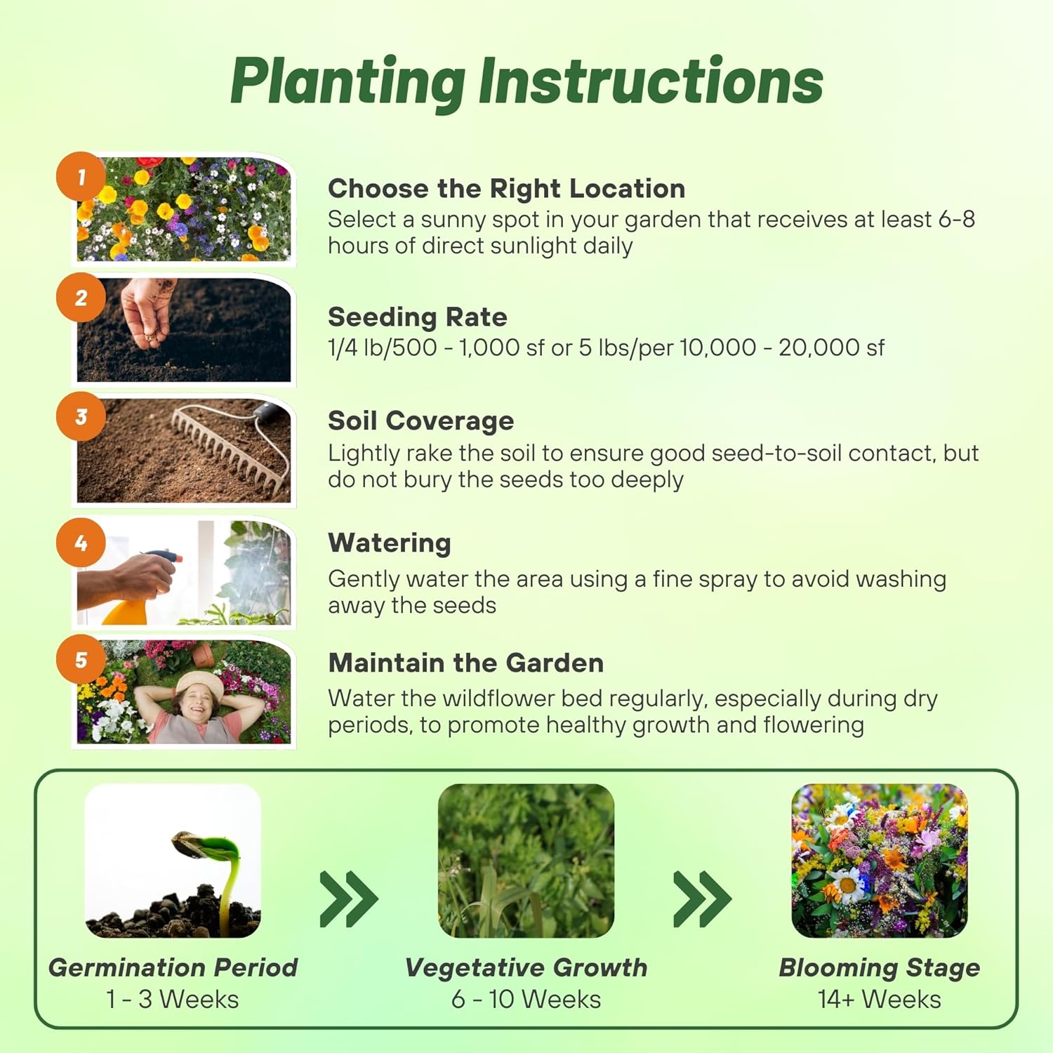 - VERSATILE PLANTING & ENHANCED AESTHETICS: Customize your garden’s look with flexible seeding rates, whether you prefer a scattered meadow or a dense, lush stand. This diverse wildflower mix adds depth, color, and texture to any landscape, creating a picturesque and tranquil outdoor space that enhances the aesthetic appeal of your home.