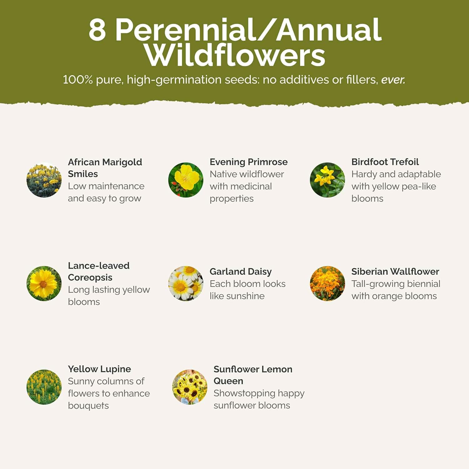 - 100% Pure, Non-GMO Seeds - No fillers, favorites only! Includes 9 easy-to-grow species: African Marigold, Evening Primrose, Birdfoot Trefoil, Lance Leaved Coreopsis, Garland Daisy, Goldfields, Siberian Wallflower, Yellow Lupine, Wild Sunflower