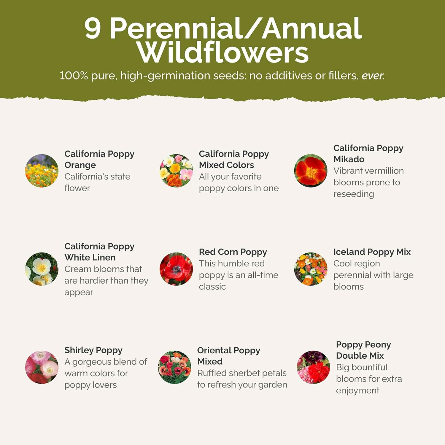 - Mix includes 50% Annual, 50% Perennial: California Poppy Orange, California Poppy Mixed Colors, California Poppy Mikado, California Poppy White Linen, Red Corn Poppy, Iceland Poppy Mix, Shirley Poppy Mixed Red and Pink, Oriental Poppy Mix, Poppy Peony Double Mix. Mix contents are subject to change.