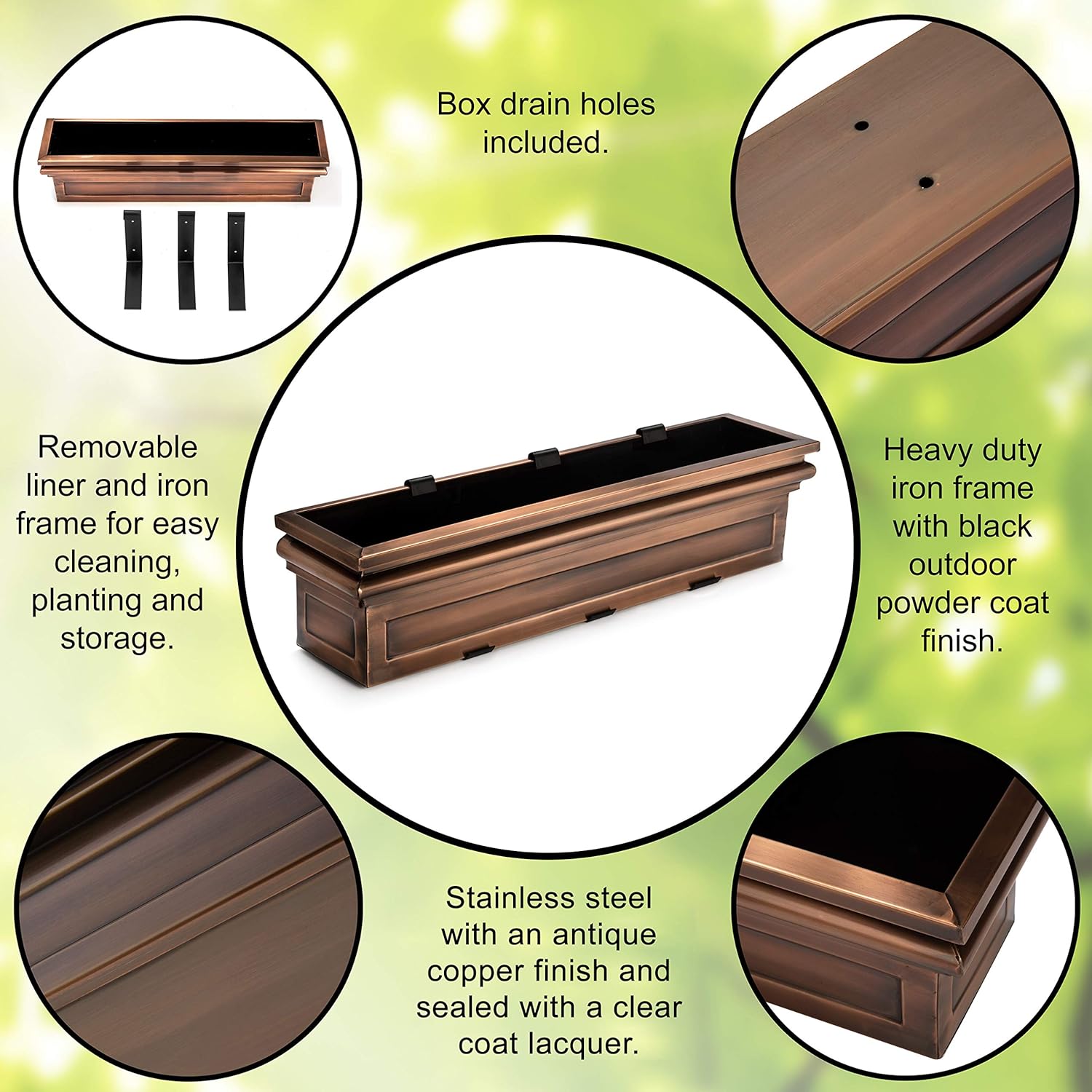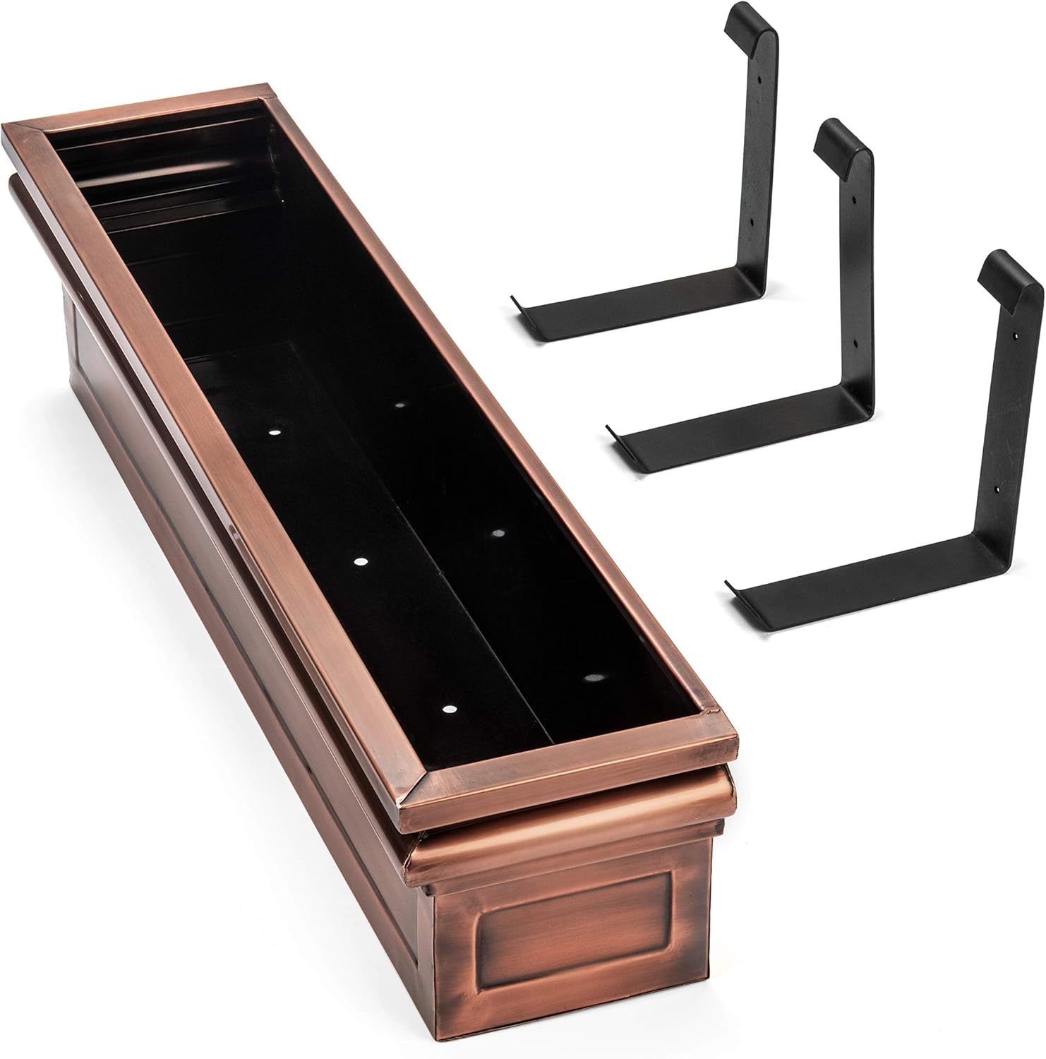 - Durable window box mounting brackets - The stainless steel construction prevents rust and corrosion to increase the lifespan of the planter, while the antique copper finish brings a new color to the outside of the home. Thick iron mounting brackets finished with a classic black, powder-coated, protective outdoor finish are included. Drainage holes in the plant box provide excellent drainage.