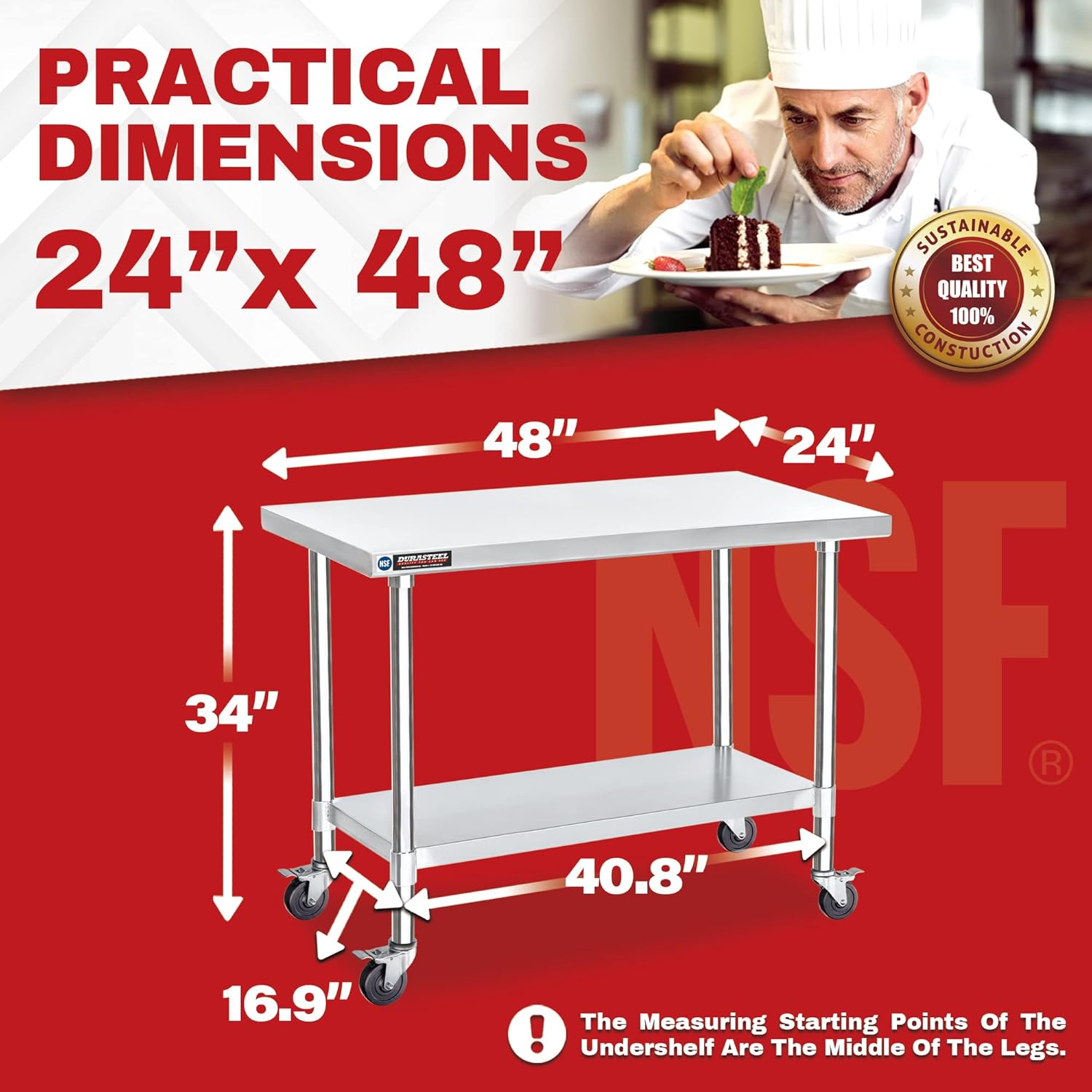 DuraSteel 24x48 NSF Stainless Steel Cart - Heavy Duty Food Prep Table with Undershelf - Rolling Kitchen Island on Wheels for Commercial Restaurant Kitchen, Garage, Outdoor Cooking, BBQ Grill, Counter