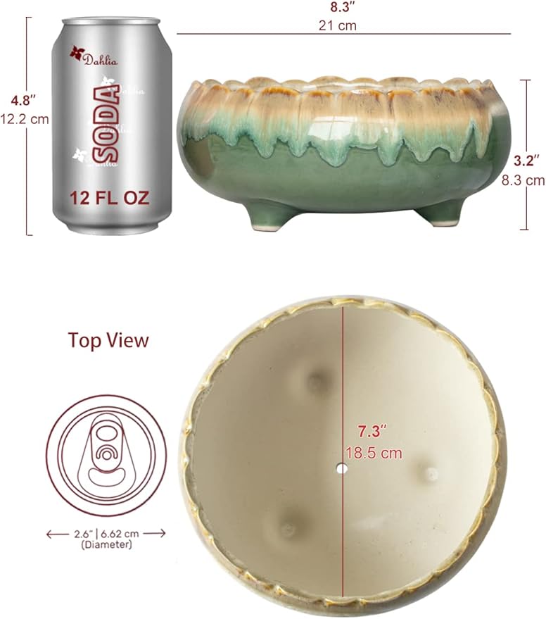 Dahlia 8.3'' Inch Large Shallow Drip Glazed Ceramic Planter/Succulent Pot/Plant Pot, Green