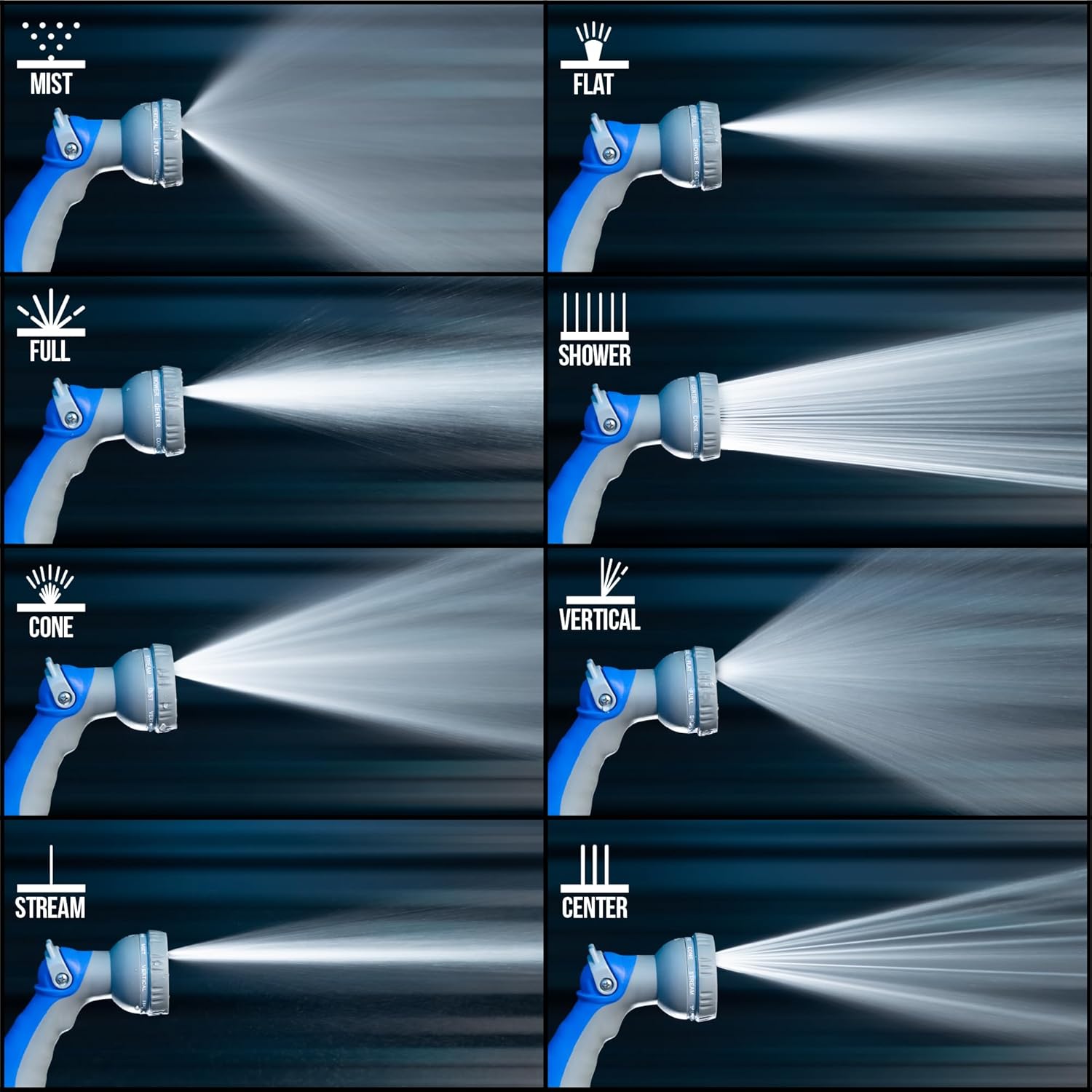 - Water hose sprayer nozzle fits on a standard garden hose has 8 different spray patterns and adjustable flow levels to fit your every need, from cleaning patio furniture to washing the dog