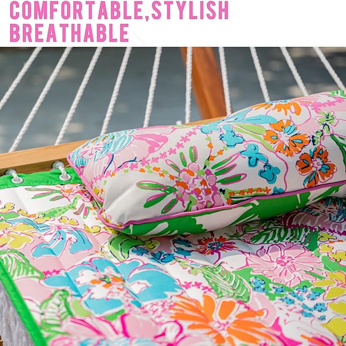 Lazy Daze Hammocks 12 FT Double Layered Quilted Fabric Hammock Swing with Pillow and Carrying Bag, Elegant Tassels and Spread Bar Heavy Duty Stylish for Two Person 450lbs, Floral