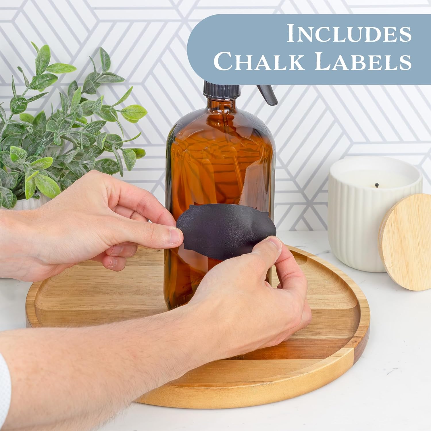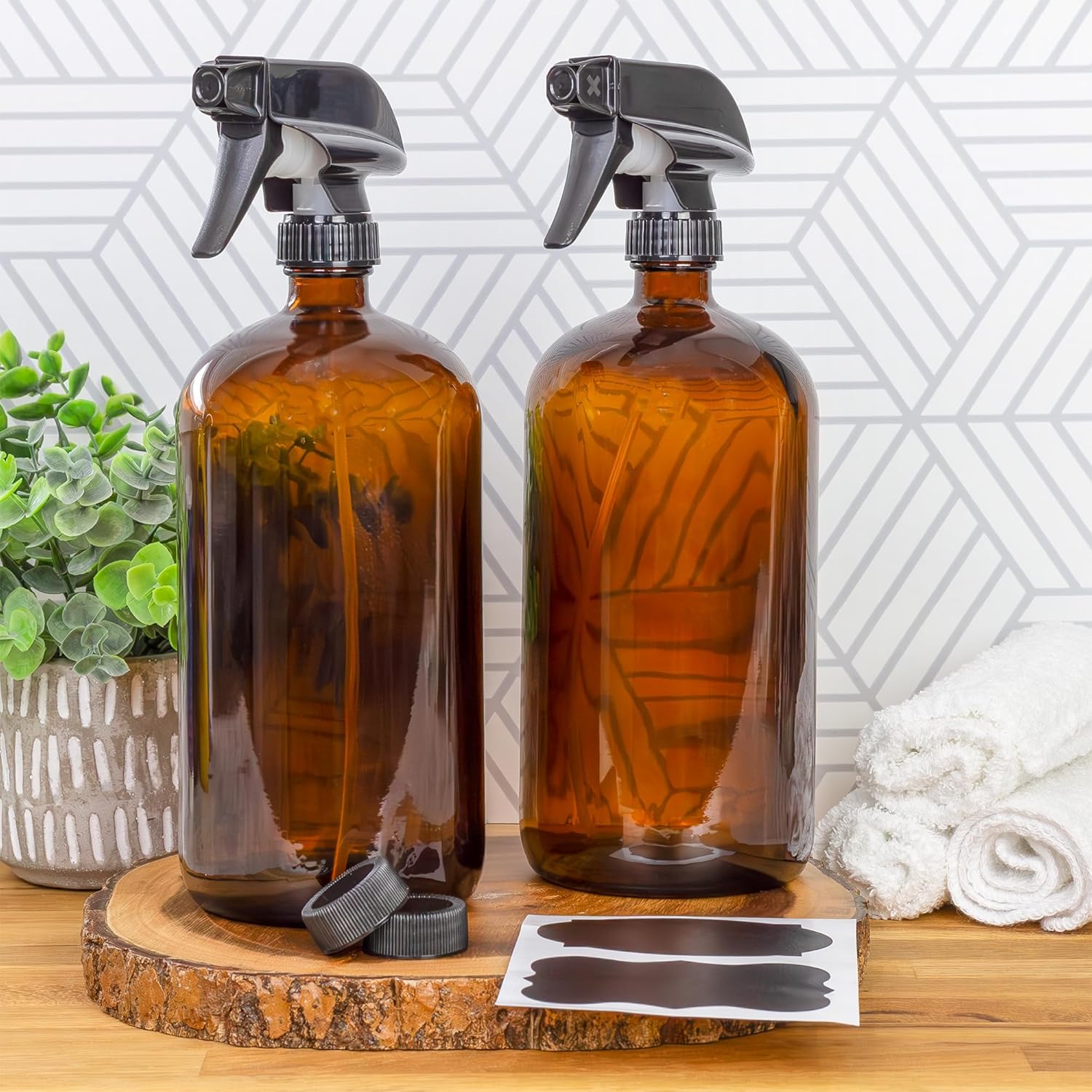- AMBER GLASS BOTTLES: Glass bottles are safest for aromatherapy & essential oils to maintain their purity. Amber color provides protection to contents from ultraviolet light. VALUE 2-PACK: You get two 32-ounce amber glass bottles, 2 trigger sprayers with 3 settings, 2 spare lids for storage & transport