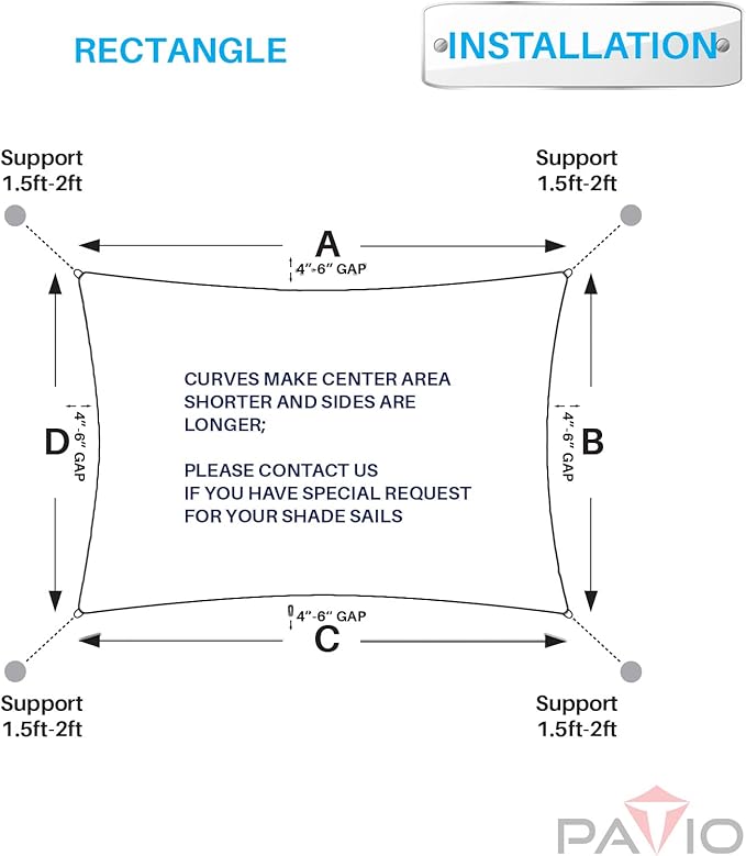- Installation: Leave a 1.5-2 foot gap between the D-ring and the fixing point for hardware installation. Maintaining a certain tilt angle can reduce water accumulation. Note: The fabric is stretchy; the titles shown are for when stretched taut.Make sure the sunshade sail is fully taut during installation, otherwise the size will be too small. Alternatively, choose a larger size