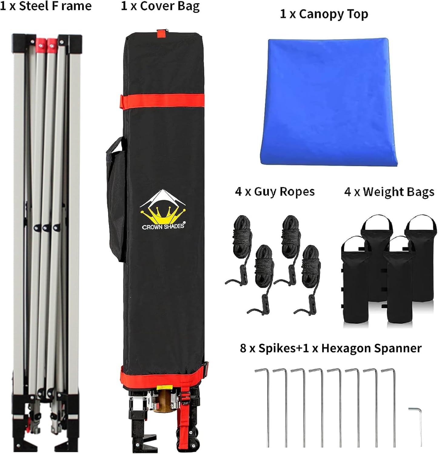 - HIGH GRADE STEEL FRAME - The durable, high-grade, corrosion-resistant steel truss frame with hardened through bolts comes pre-assembled and can be set up without any tools. Engineered to support up to 120 lbs. distributed across the frame, it ensures robust and reliable performance. The extended ceiling assembly and upgraded high peak design make it easier for rainwater to run off, preventing water pooling on the canopy. Perfect for extended outdoor use at markets, festivals, and exhibitions