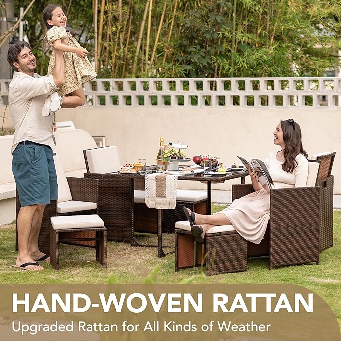 - [Upgrade your Courtyard] The design of 9 pieces patio dining sets will go well with any garden or backyard arrangement and landscaping. Fashionable rattan and modern design complements any space and the sturdy construction will make this piece a favorite of yours for summers to come, creating a beautiful and luxurious outdoor living space for you and your guests