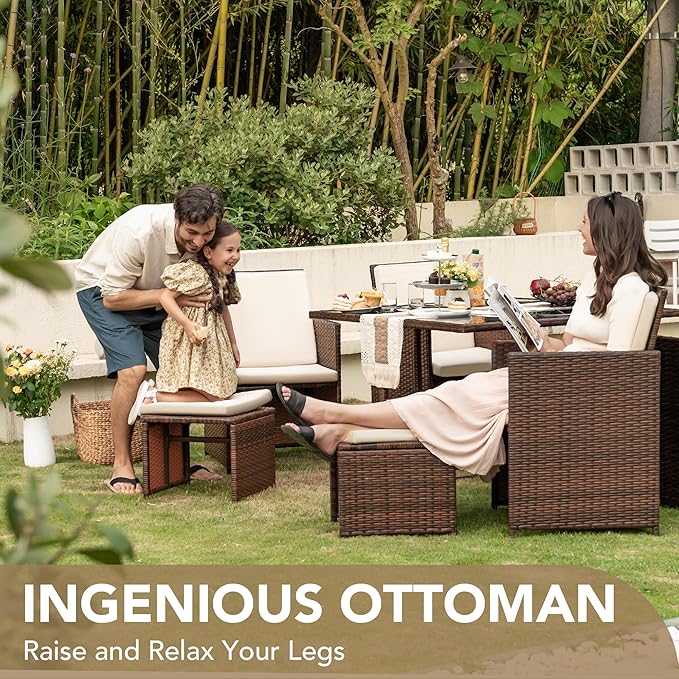 - [Comfortable Patio Dining Set] Devoko 9 pieces patio dining sets including 1 table, 4 single chairs, 4 ottomans and 12 cushions. These zippered cushions fill with thick giving you optimal comfort and relaxation