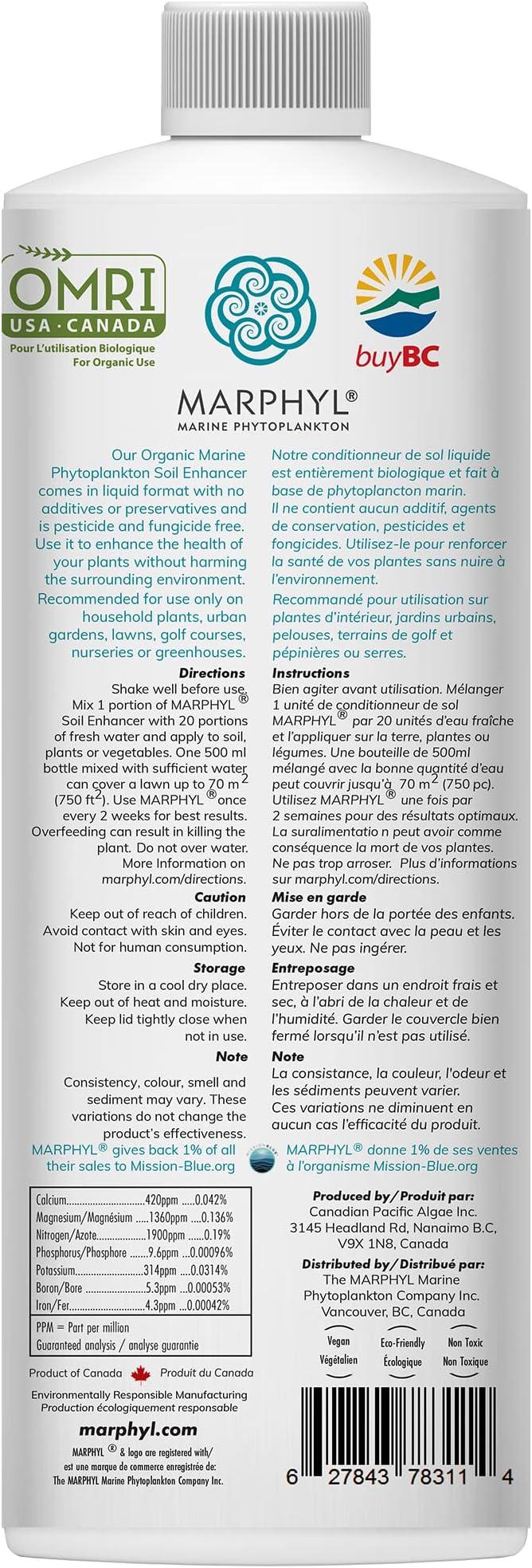 - NATURALLY BOOST PLANT HEALTH - Marine Phytoplankton are Microalgae full of nutrients, vitamins, and minerals. It's so much more than your average liquid plant fertilizer. MARPHYL's fertilizer for indoor plants and outdoor plants, grasses, trees, flowers and more, provides an astounding array of nutritional elements. Packed with vitamins, minerals, essential fatty acids, DHA, EPA, amino acids, chlorophyll, and a vast spectrum of phytochemicals, so your lawn, garden, and greenhouses will flourish