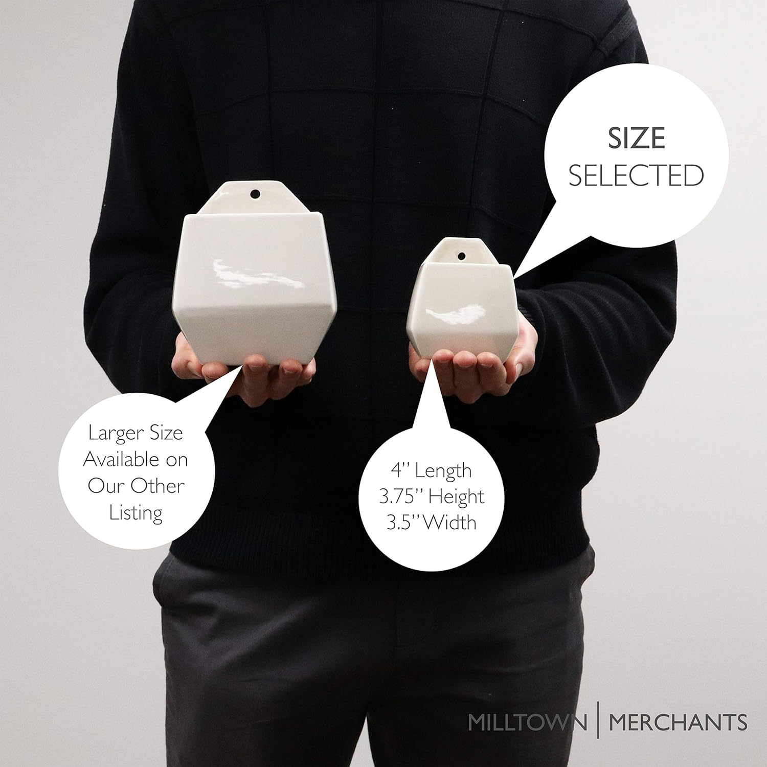 - MILLTOWN MERCHANTS HANGING PLANTER - The simplistic design of each Milltown Merchants hanging planter infuses minimalist and contemporary styling to create the perfect floating vase. Our beautiful white and black floating planters offer the ideal contrast for showcasing succulents, greenery, and small plants.