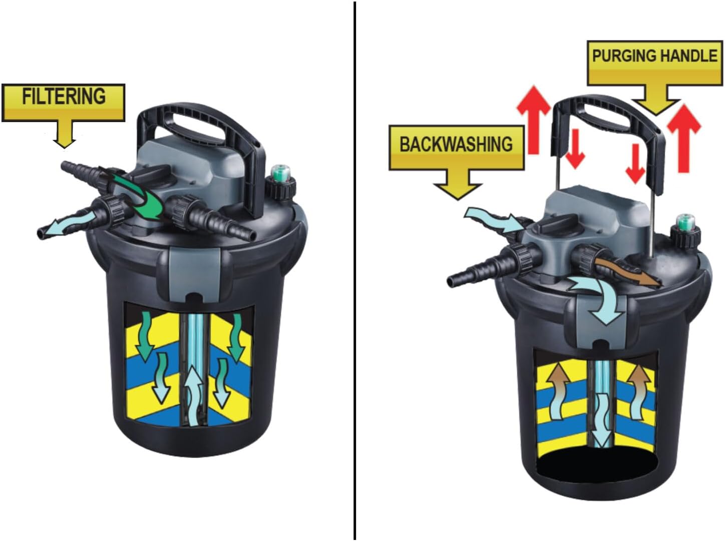 - 2-Stage filtration removes coarse and fine floating particulate to promote a healthy pond environment.