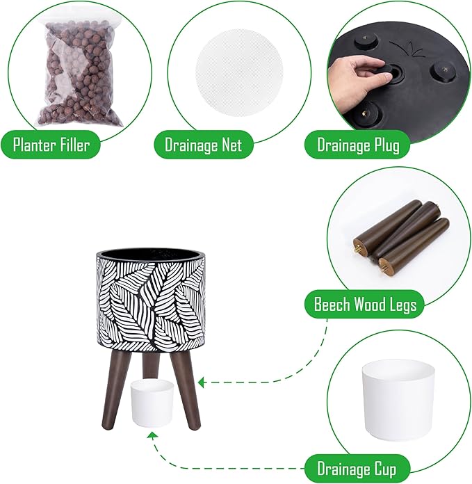 - What’s included: planter pot with drainage hole, drainage plug, set of stand – 3 solid wooden legs.