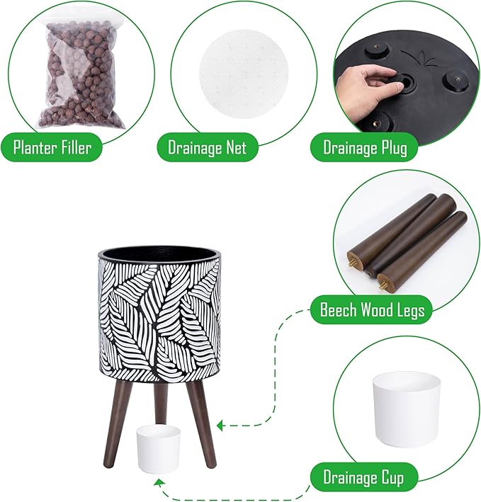 - What’s included: planter pot with drainage hole, drainage plug, set of stand – 3 solid wooden legs.
