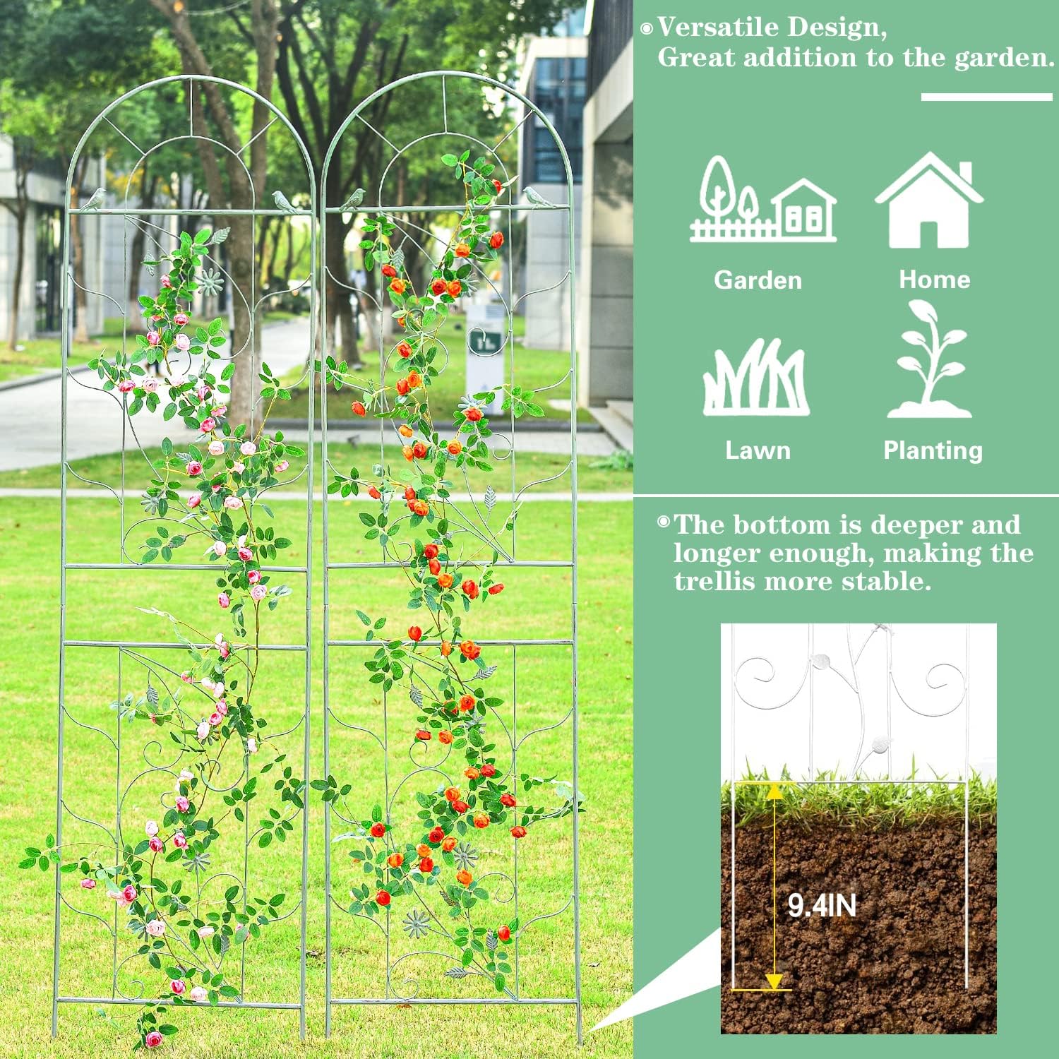 Sungmor Large Metal Garden Trellises for Climbing Plants - 82.5 Inch Tall & 2PC Green Pack - Beautiful Retro Style Metal Fence Trellis - Gardening Vines Plant Support for Flower Rose Climbing