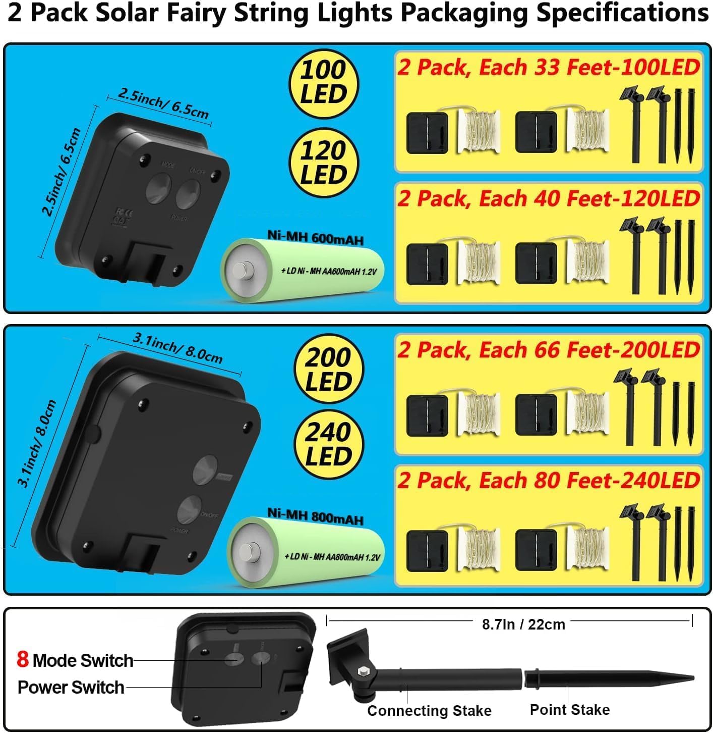 2 Pack Solar Powered Fairy String Lights Outdoor Waterproof 8 Modes Twinkle Christmas Decorations Lights, Each 33ft-100LED, 40ft-120LED, 66ft-200LED, 80ft-240LED, (Multicolor, 33)