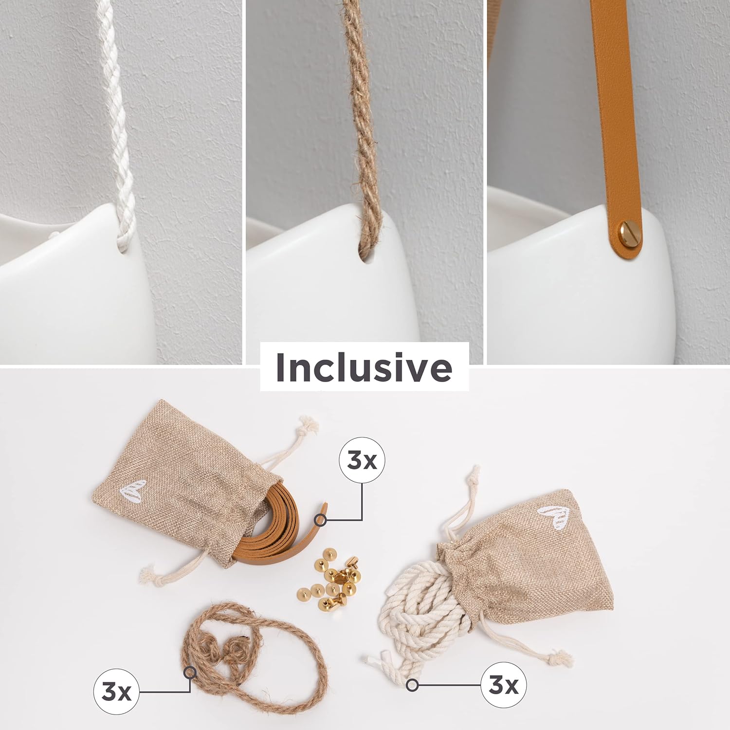 - Multipurpose Usage: Each set consists of 3 glazed ceramic wall vases, and comes with 3 different sets of hangers. Brown hemp ropes are already pre-assembled on the pots.