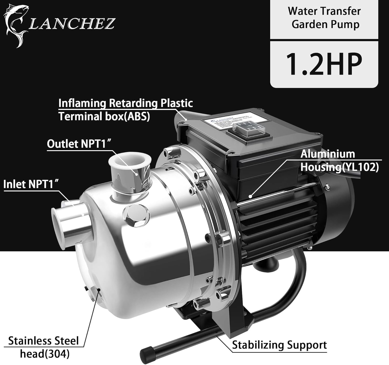 LANCHEZ 1/2 HP Shallow Well Garden Pump, Portable Stainless Steel Water Transfer Draining Irrigation Pump for Lawn Fountain, 960 GPH, 125 Feet Height