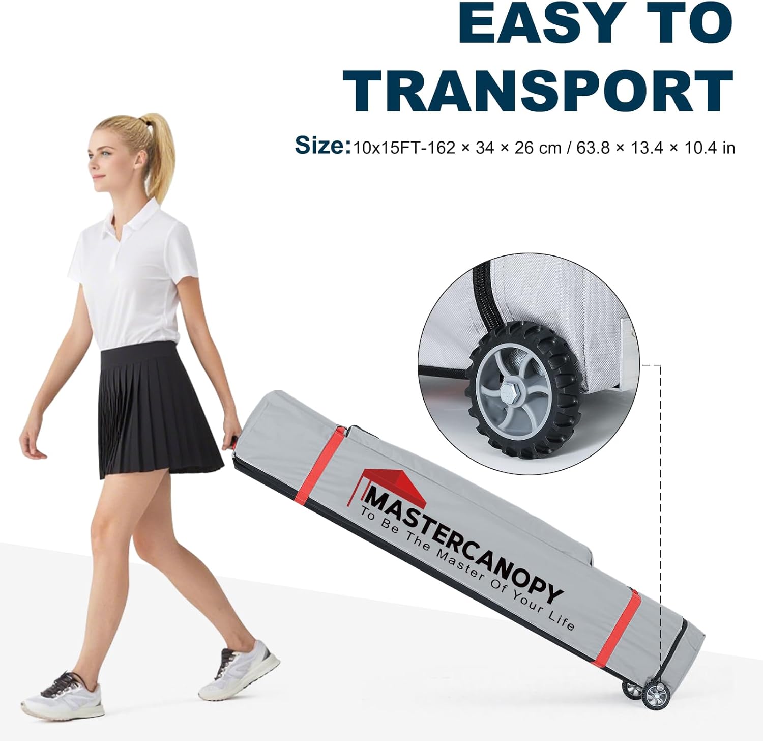 - ✅Large Space: 10 x 15 Pop Up Canopy with straight legs provides a true 150 square feet shade. Big enough for about 6-10 people to sit under it. Center height is 132 inch. Suitable for market stalls, parties, picnics or any outdoor events. MASTERCANOPY commercial canopy tent is suitable for both sunny and rainy days.