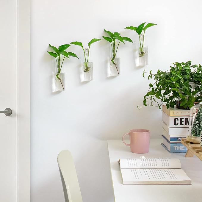 - Versatile Use: Includes four hanging vases, giving you plenty of options to create stunning plant arrangements. Hang them near windows, on walls, or place them on shelves for a beautiful vertical garden effect. Also be placed on the desktop. A small hole on the top back of vase which is convenient for hanging the plant stand on the wall. Easy to install and remove, convenient for cleaning or changing water for plants.
