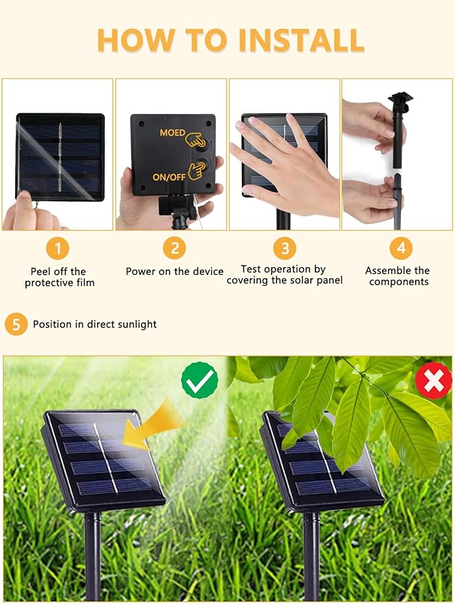- 8 Lighting Modes & Auto On/Off & Memory Function: The solar twinkle lights have 8 lighting modes for selection. After powered on, just press the mode button to choose your favorite mode to satisfy your diverse needs. And the built-in memory chip saves your last mode setting, so there is no need to reset it everyday. It is very convenient for use outdoor. With the built-in light sensor, the lights will turn on at dusk and turn off at down automatically