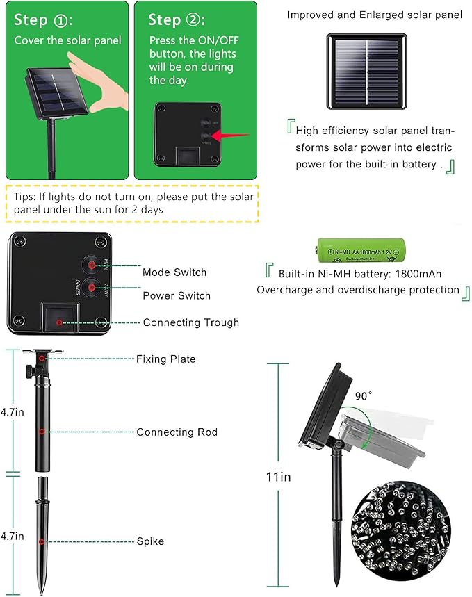 - 8 Lighting Modes & Auto On/Off & Memory Function: The solar twinkle lights have 8 lighting modes for selection. After powered on, just press the mode button to choose your favorite mode to satisfy your diverse needs. And the built-in memory chip saves your last mode setting, so there is no need to reset it everyday. It is very convenient for use outdoor. With the built-in light sensor, the lights will turn on at dusk and turn off at down automatically