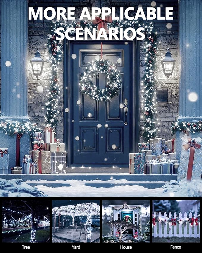 - Widely Used Solar Christmas Lights for Outside: The soft bendable LED solar light string is easy to wrap anywhere. It is a great decor outdoor for all festivals and seasons. With the cozy cool white light, the solar xmas lights are perfect for Christmas, Thanksgiving, Wedding, New Year, birthday parties and daily decorations. It can be widely used for patios, backyards, decks, porches, stairs, barbecues, umbrellas, fences, pergolas, bistros, restaurants, hotels, commercial buildings, shopping centers and more