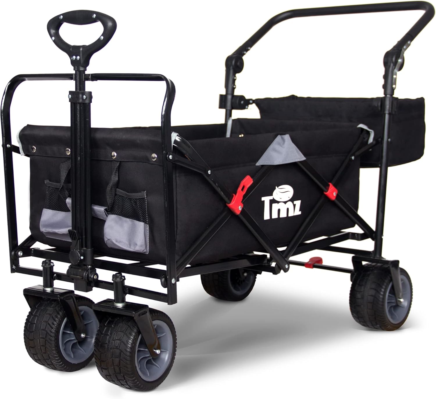 TMZ All Terrain Utility Folding Wagon, Collapsible Garden Cart, Heavy Duty Beach Wagon, for Shopping, Camping, and Outdoor Activities with Push Handle and Brakes (Black/Grey)