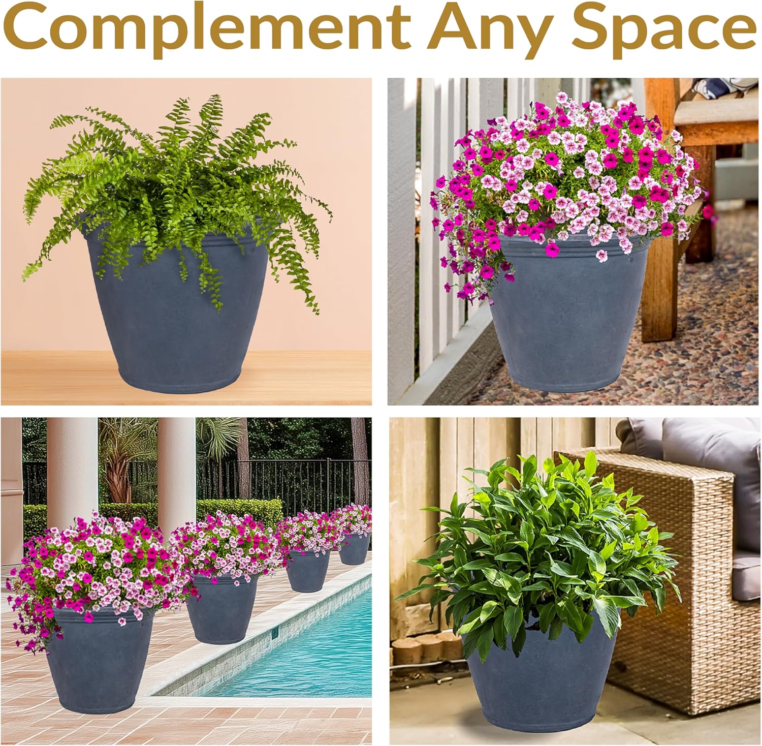 - AMPLE GROWING SPACE: This outdoor flowerpot has a 24" outer top diameter, 21" inner top diameter, 14.5" outer bottom diameter, 14" inner bottom diameter, 20" outer height, and 18" inner height. The planter weighs 6.4 lbs. It can hold 19 gallons/2.54 cubic feet/76 quarts. The large size makes this planter great for growing plants and flowers both inside and outside.