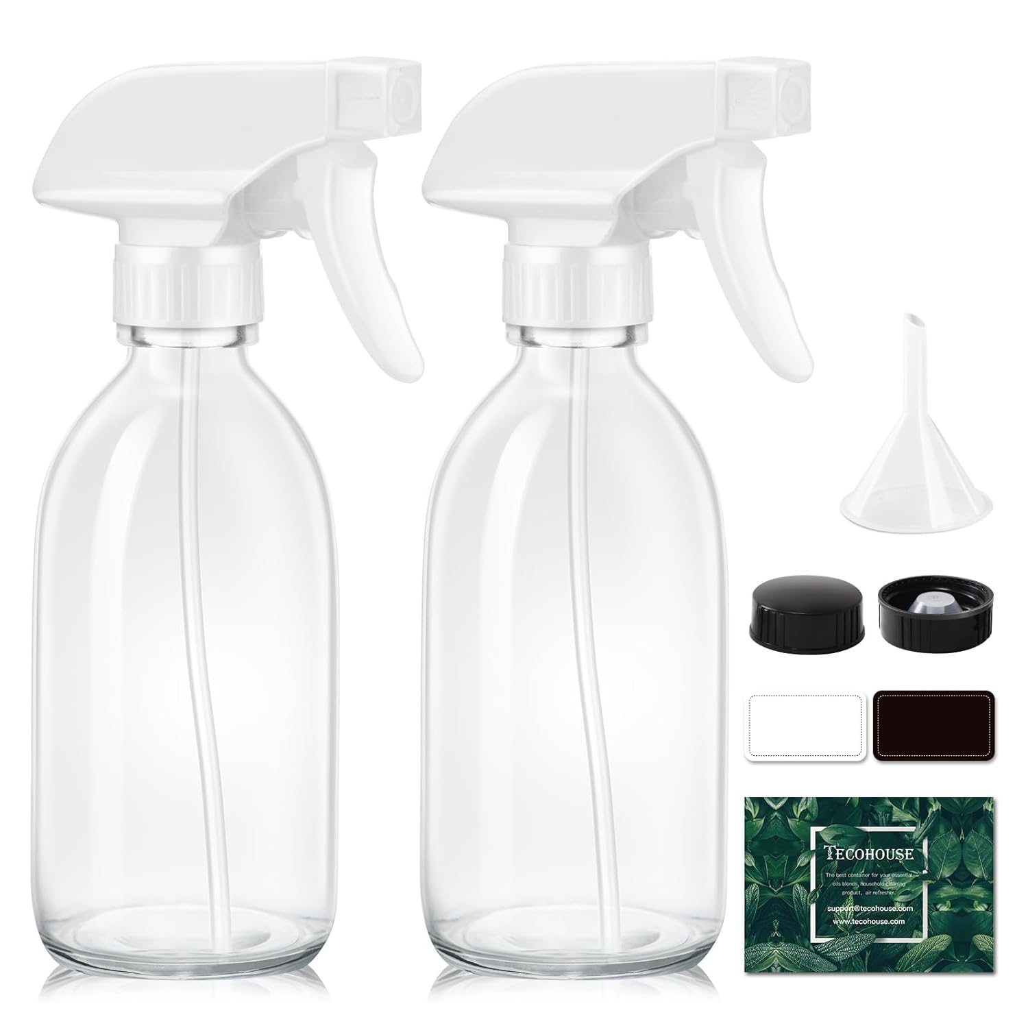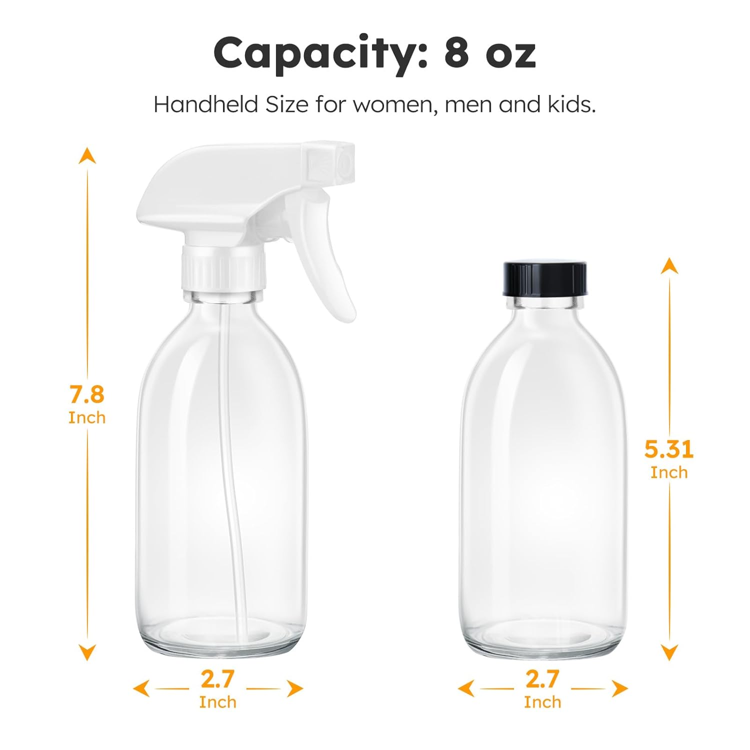 Tecohouse Glass Spray Bottle 8 oz, Clear Small Empty Refillable Sprayer Container with Labels, Funnel, Lids, Graduated Pipettes - Handheld Size