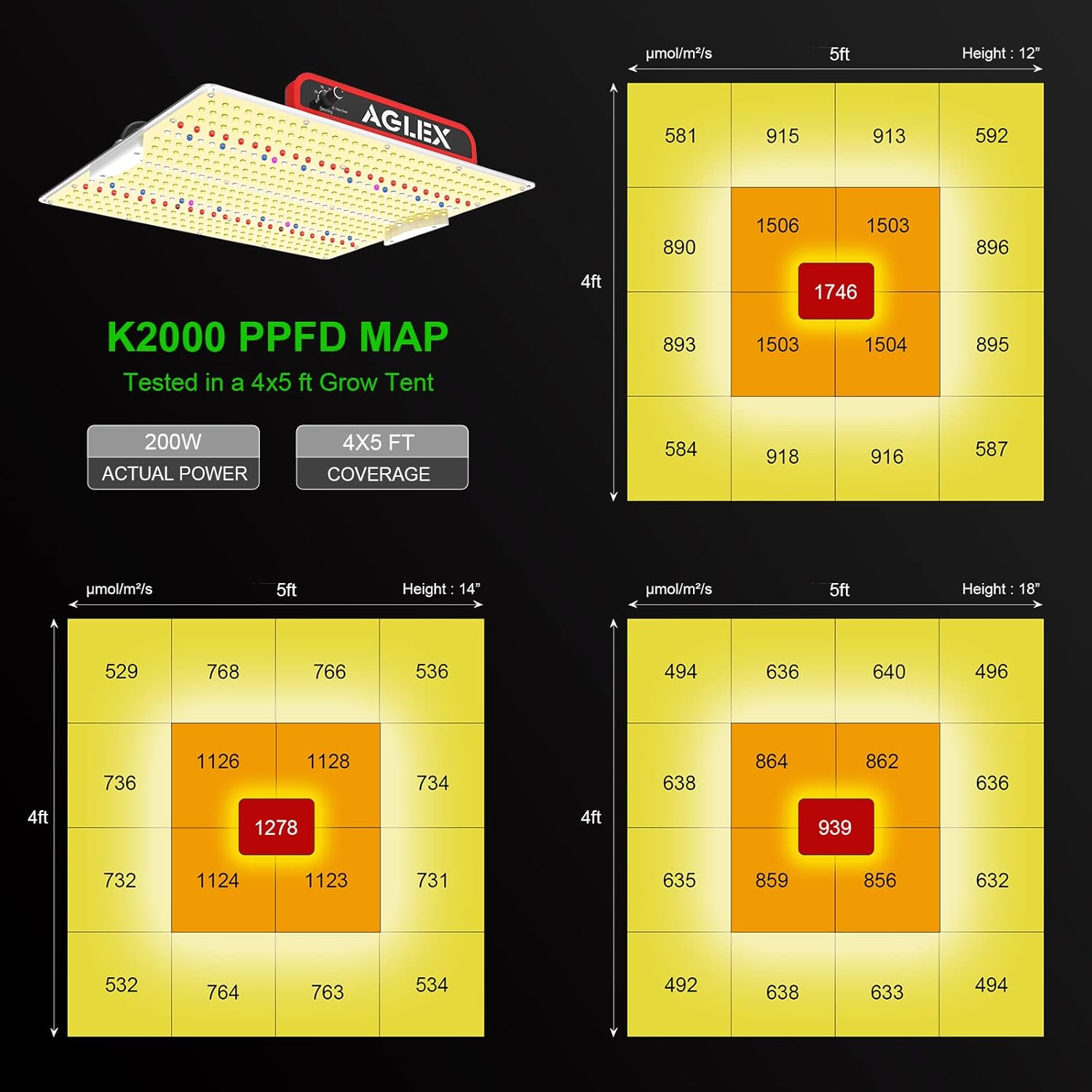 - LOWER COST & HIGH YIELDS - AGLEX K2000 led plant growing lights use the newest high-yield SMD LED technology - 528Pcs diodes. Though the LED Growing Lights only consumes 200 watt of power, achieving higher average PPFD with 1746 umol/㎡/s at 4x5ft max coverage. It is also an ideal LED grow light from seeds to harvest. It will be a perfect option if you¡¯d like to light a small space, add a little light to your current space, or use it for clones, seedlings, or mothers.