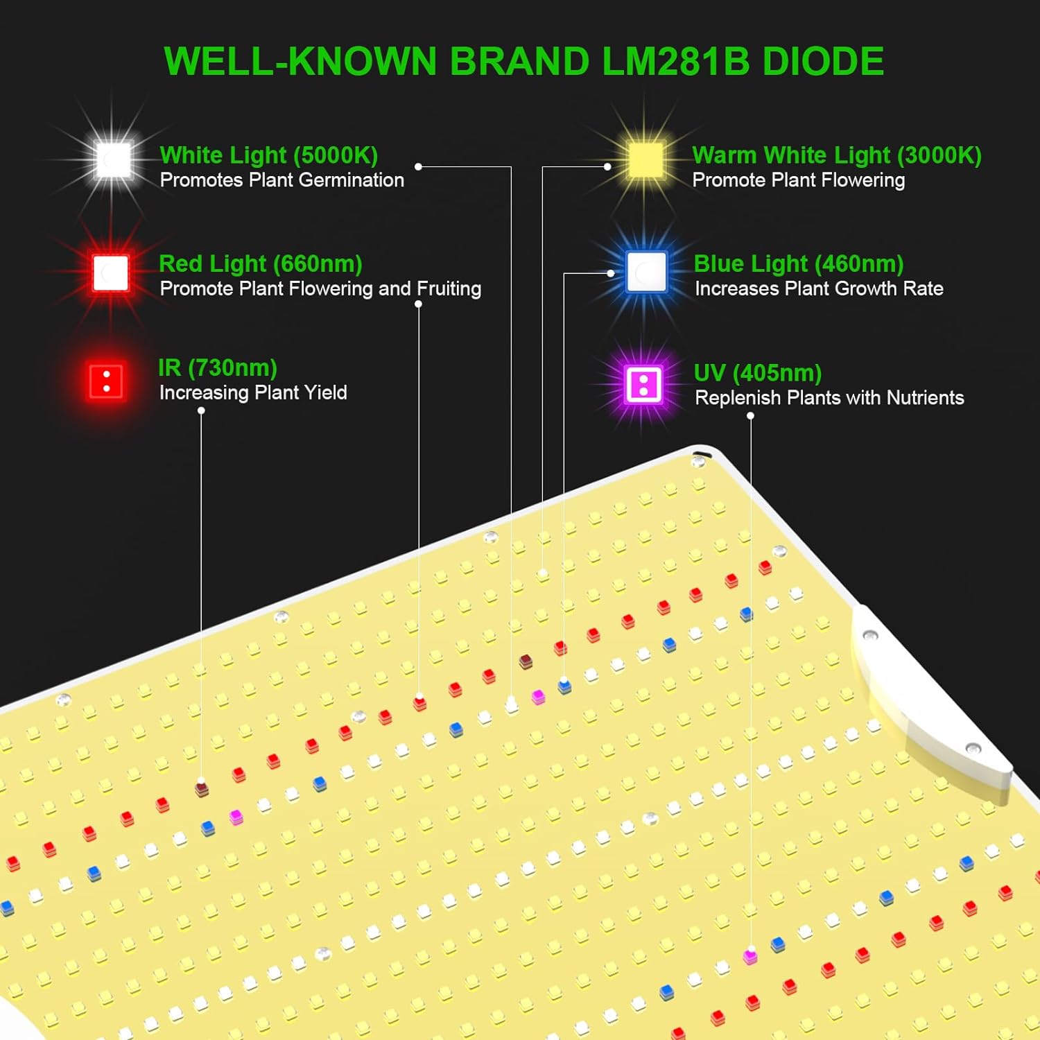 - AMAZING HEAT DISSIPATION & WORKING QUIET - LED light board style and aluminum material can help quickly heat dissipation, reduce the light lost in walkways and walls, increase the light intensity, ensure longer lifetime and lower energy bill. With no fan design, the led grow light full spectrum can provide a quiet working environment without interruption.