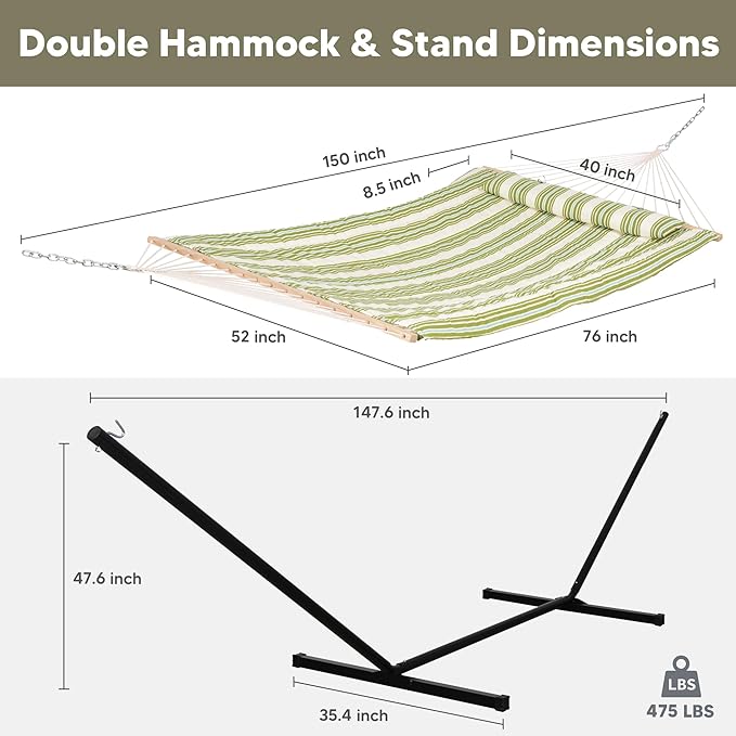 SUNCREAT Cotton Rope Hammock for Two People with Hardwood Spreader Bars, Quilted Fabric Pad & Detachable Pillow, Extra Large Hammock with 12 FT Steel Stand, Ipad Bag & Cup Holder, Green&Beige