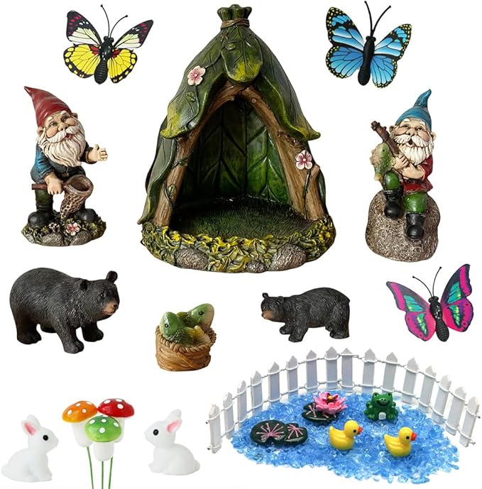 - Perfect gift idea for all ages and all celebrations – Everyone loves gnomes. There are fishing gnome figurine, netting fish gnome statue,2 bears, fish weel,fairy house,rabbits, fences,butterflies,mushrooms,frog,lotus,duck, blue gravel, and 3 stickers for endless creative fun!