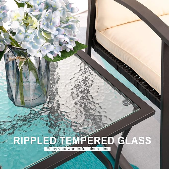 - EASY MAINTAIN BISTRO:This 3 piece bistro set features zippered seat cushion covers, removable and washable for easy cleaning; Tempered glass on the side table adds more convenience to clean if any drinks drops on it.
