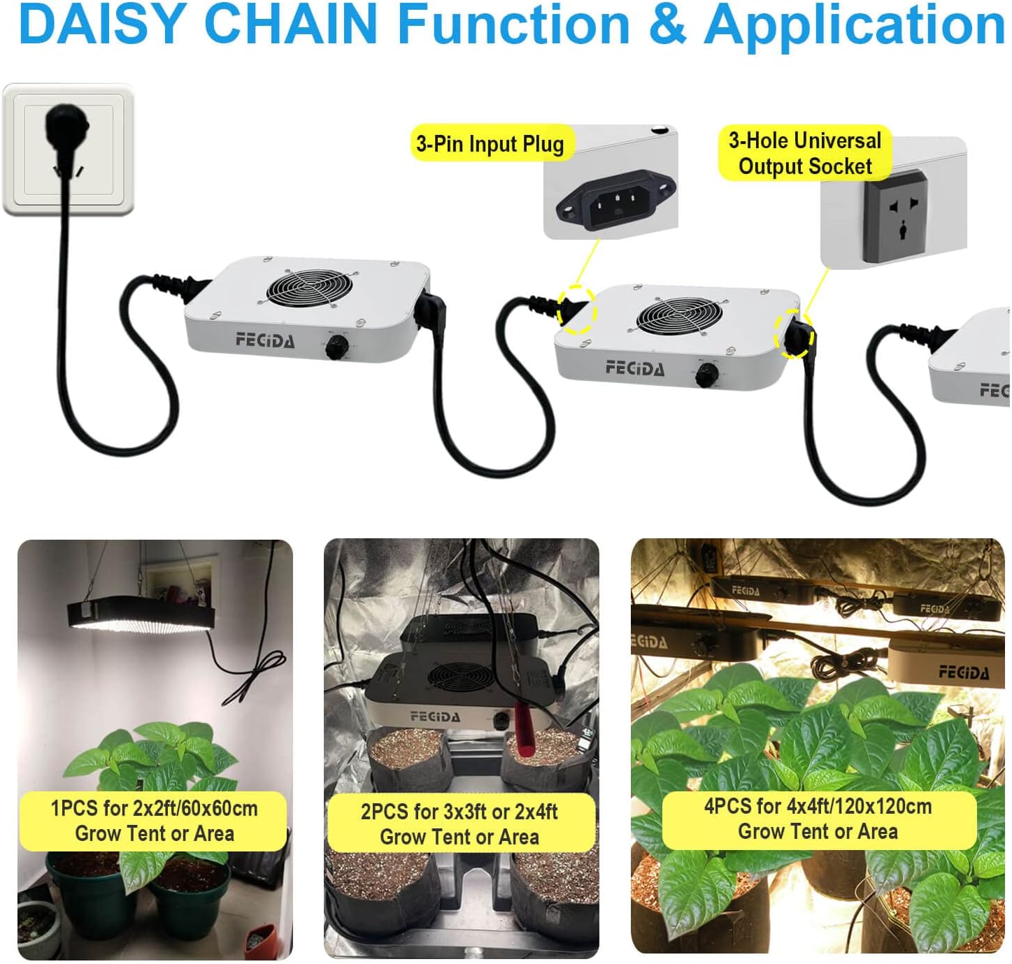 - 【Daisy Chain Function & Easy To Use】The power cable in the package is also just the daisy chain cable. You can use one power cable to connect the grow light to your home electricity and use other power cable to connect the grow lights together if you have more than two grow lights. You can connect max 4pcs 130 Watt plant grow light together.