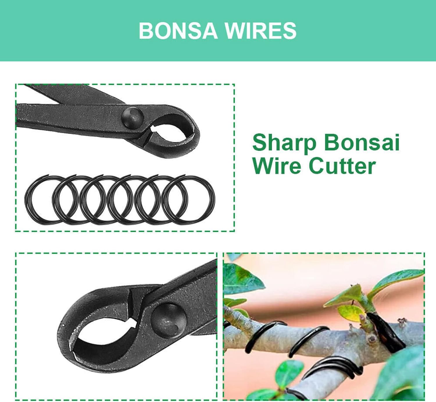 - 10 carbon steel Bonsai Tools Kit Set including Leaf Trimmer, Scissors, Jin pliers, Root Hook, Knob Cutter, Aluminium Wires and Wire cutter, etc. All well packed in a Nylon zipped case.