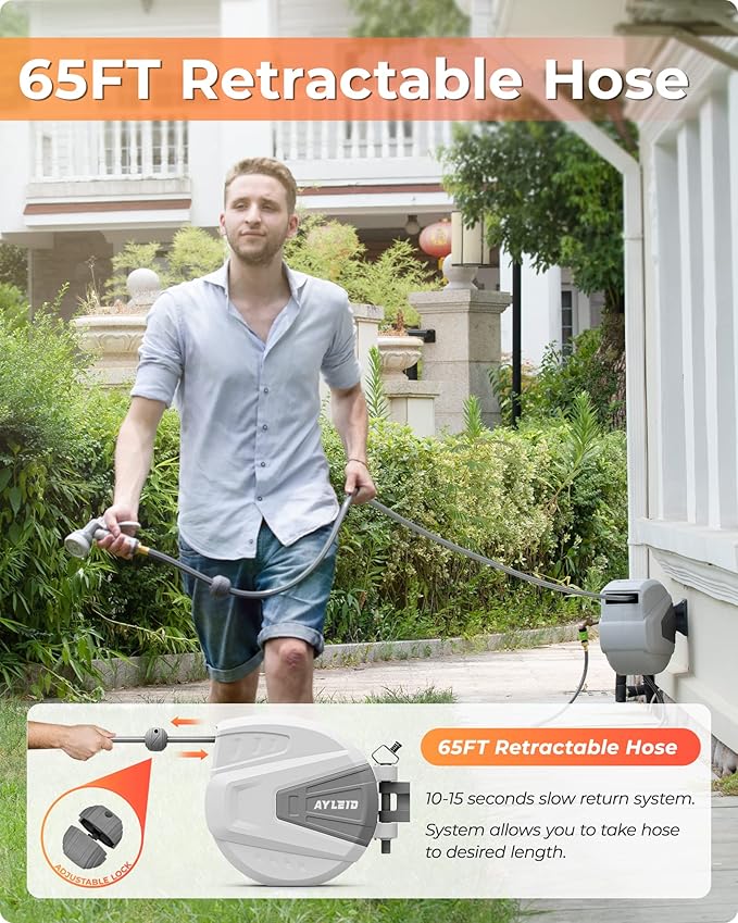 - Effort-Saving Design:1/2 in × 65 ft retractable hose reel with lightweight housing and internal spring reduces pulling resistance, making extension and retraction smoother for daily watering.