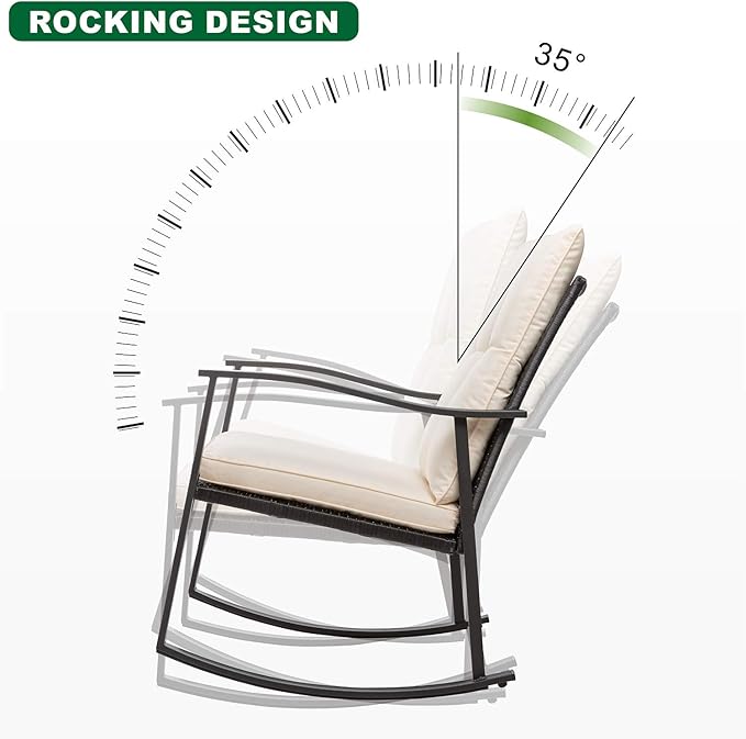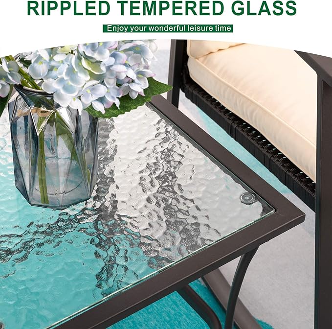 - Easy Cleaning And Maintain: 3 piece rocking bistro set included weather resistant wicker, and a coffee table with tempered glass, is easy to clean. Zippered cushion covers are made of superior fabric, fade resistant, water spill repellent and washable.