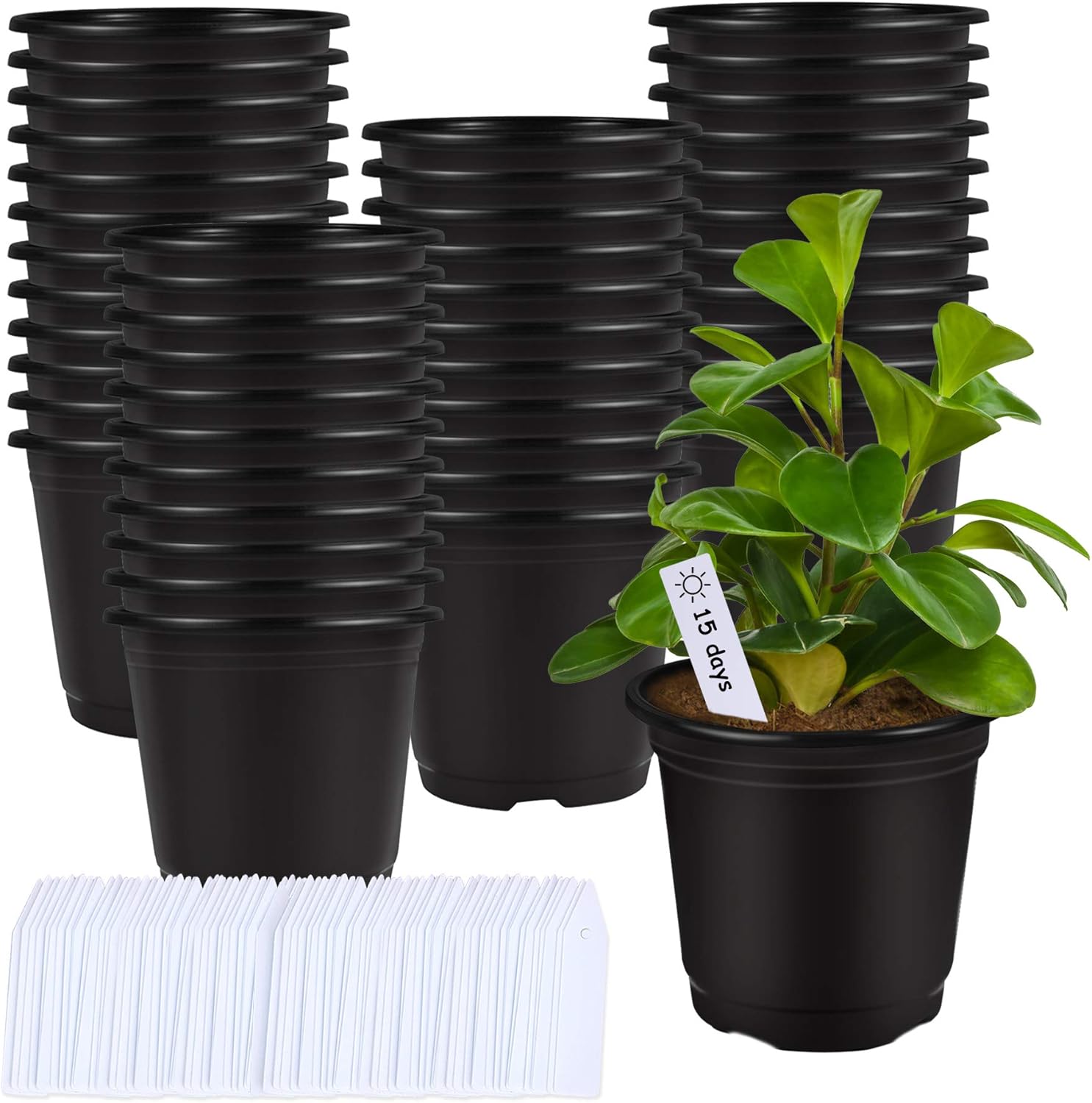 Augshy 75 Pcs 0.5 Gallon Black Plastic Plant Nursery Garden Pots 6 Inches Seed Starting Pots Containers with 100 Labels