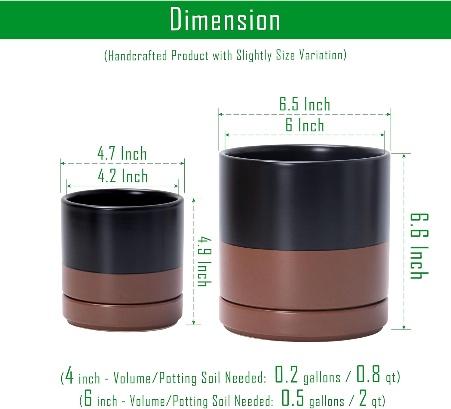 - Small Set of 2 Plant Pots Dimensions: 4.7" Diameter (4.2" Inner Diameter) * 4.9" Height; 6.5" Diameter (6" Inner Diameter) * 6.6" Height. Potting Soil Needed: 4-inch 0.8 qt; 6-inch 2 qt.