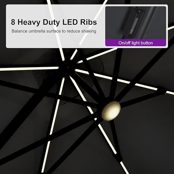 - Powder coated all-aluminum umbrella bones and 8 heavy-duty ribs and comes with led lights that is powered by a solar panel on top, design for durability and enjoyment for outdoor use.