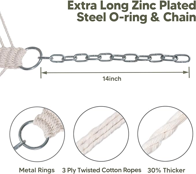 - Upgraded 30% Thicker Ropes: The upgraded strong poly-cotton ropes are hand-woven with comfortable, long-lasting threads woven by the hammock artisans, 30% thicker than before. The 20 ropes are collected together and woven into a triangle pattern which is pleasing to the eye. O-shaped steel ring attaches the ropes and the chain