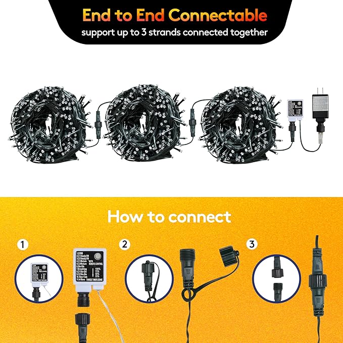 - End to End Connectable & Smart Remote Control: Our twinkle string lights allow up to 3 strands to be connected together to illuminate a wider area. 3 strands will give you 306ft and 900 LEDs to use and will only take up one electrical socket. It also comes with a smart remote to provide you with the greatest convenience.