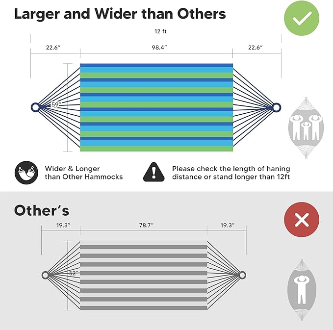 - Larger Bearing Capacity: The heavy duty hammock's total length (from loop to loop) is 144 Inches while the bed size is 98”long X 59”wide, making it perfect for couples
