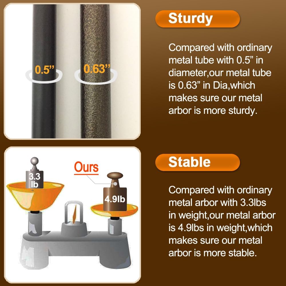 - Heavy & Sturdy:The 4.9 lbs of garden trellis is heavier than others.Constructed of metal tubing and coated in weather-resistant epoxy.Tall vertical frame with 4 stakes into ground,more stable.