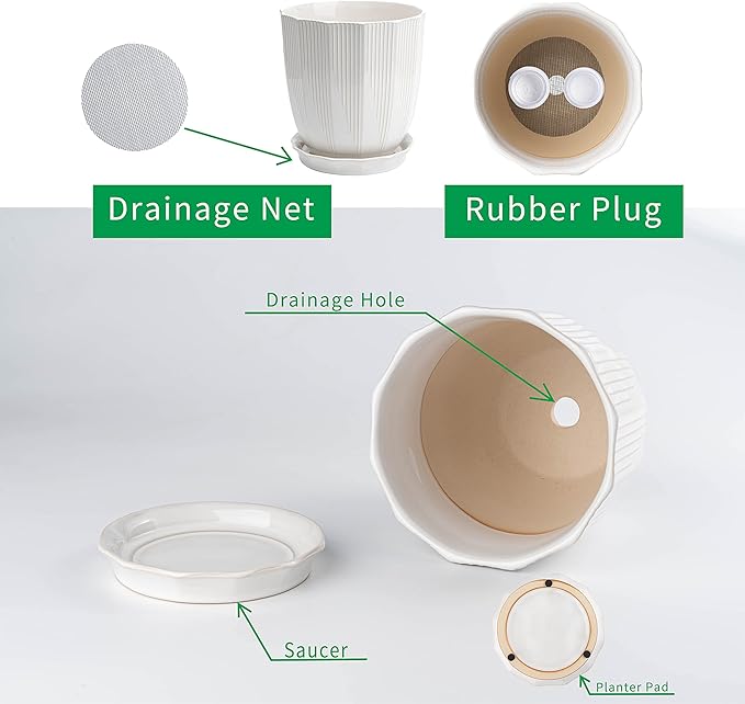 - Kit Includes: A ceramic plant pot, a saucer, a drainage net, a rubber plug in each pack. Great gifts for housewarming! ( Tips: plants not included)