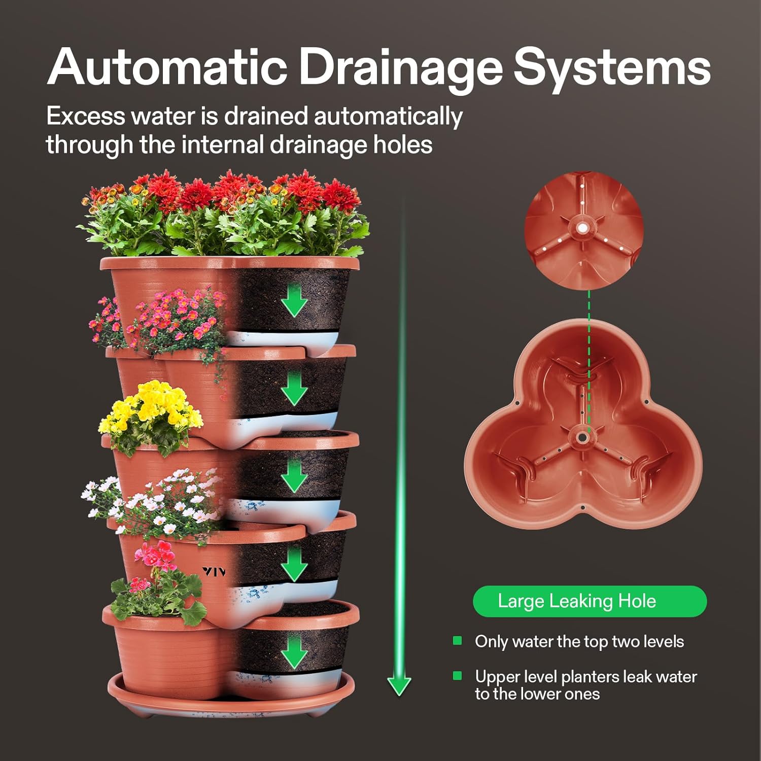 - Flow Design: The water filtration system from top to bottom can effectively save and retain moisture; Meanwhile, the bottom is equipped with a bottom dish that will not stain the ground