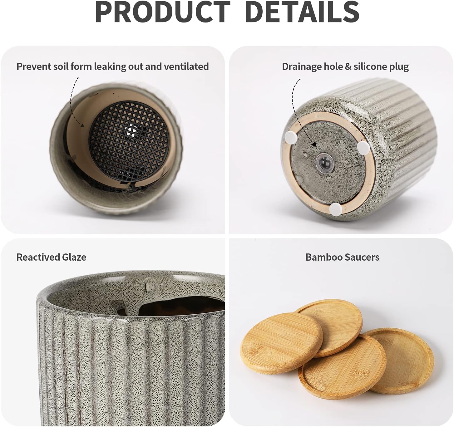 TAMAYKIM 4 Inch Cylinder Ceramic Plant Pots with Drainage Holes & Saucers, Glazed Green Grey Small Boho Planters with Trays for Indoor Flower, Snake Plants, Succulent, Cactus, Set of 4