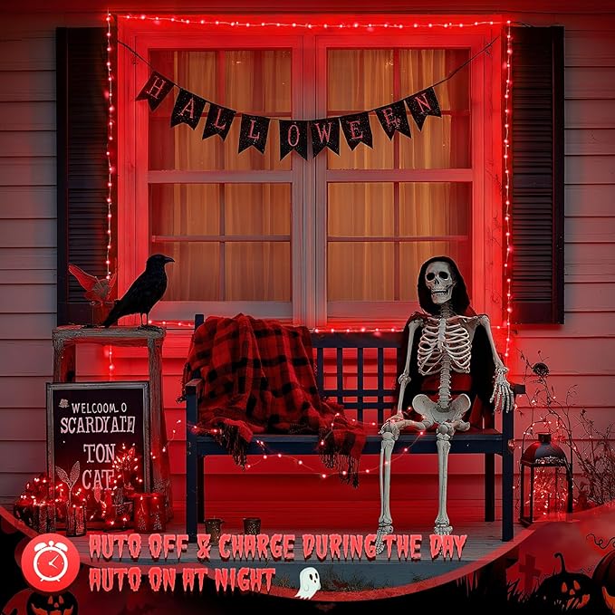 - 【FLEXIBLE & DURABLE RED LIGHTS OUTDOOR】You can bend the flexible silver wire into a heart shape or pentacle and you can wrap the halloween solar lights around tree trunks or gazebos. Solar fairy lights will not overheat after being used for many hours, durable, and safe to use.